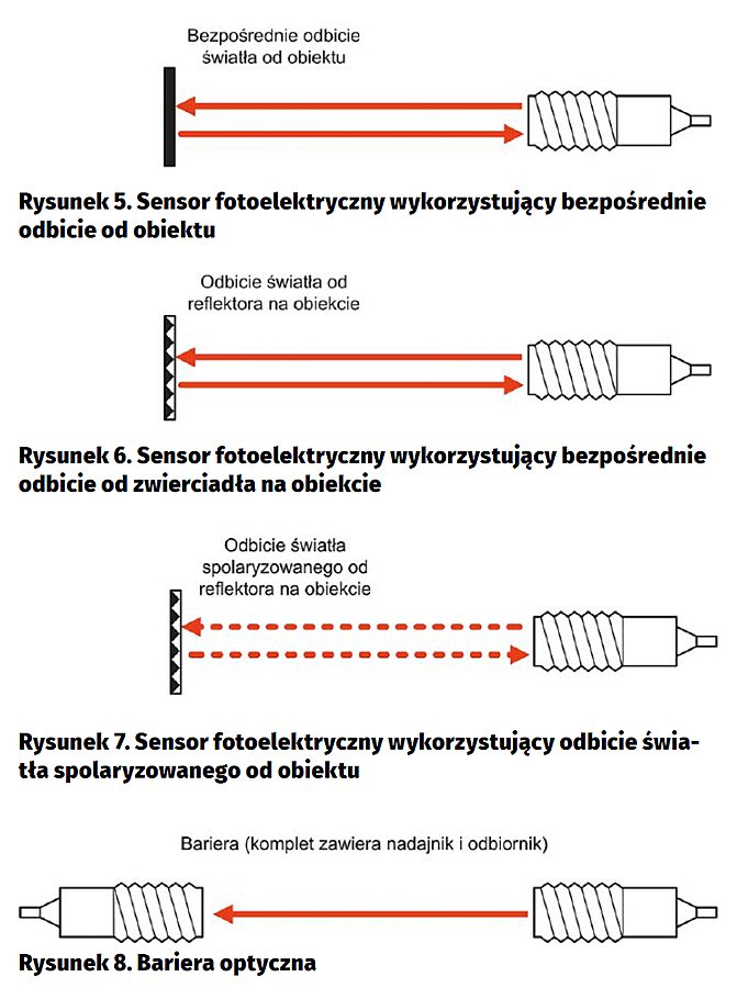 Sensory fotoelektryczne najczęściej są produkowane jako odbiornik zespolony ze źródłem światła. Spotykane są również wykonania w postaci odrębnych modułów nadajnika i odbiornika (bariera). Współcześnie źródłem światła są albo diody LED, albo diody laserowe. Aby uodpornić czujnik na zakłócenia a także zmniejszyć pobór energii, bardzo często wiązka światła poddawana jest modulacji. Odbiornik bazuje na elemencie fotoelektrycznym. Zaletami tego typu sensorów są duża rozdzielczość umożliwiająca detekcję również bardzo małych obiektów i niewielkich przemieszczeń, duży zasięg detekcji oraz krótki czas reakcji. Podstawową wadą jest wrażliwość na zanieczyszczenia, na kolor powierzchni i jej zdolność do odbijania/pochłaniania światła. Niestety trudno jest dobrać sensor fotoelektryczny, który będzie uniwersalny. W handlu dostępne są cztery podstawowe rodzaje tego typu czujników, których właściwości krótko omówiono niżej. Oczywiście niektórzy producenci mogą oferować czujniki łączące w sobie różne cechy funkcjonalne.