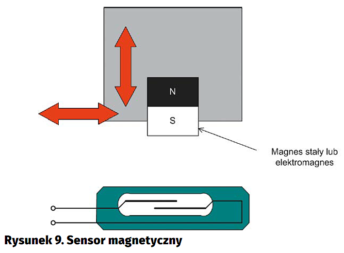 Czujnik magnetyczny (rysunek 9) jest najprostszym z dostępnych w handlu. Tego typu sensor reaguje na pole magnetyczne magnesu stałego lub elektromagnesu zwierając swoje styki. Do jego konstrukcji bardzo często wykorzystuje się kontaktrony, które mają styki zamknięte w hermetycznej obudowie szklanej wypełnionej gazem obojętnym. Styki wykonane są z materiału odpowiedniego dla przewodzenia małych prądów. Można je również wykonywać w wersjach przeznaczonych do przenoszenia dużych obciążeń indukcyjnych i dzięki temu załączać układy wykonawcze wnoszące obciążenia do kilku Amper bez elementów pośredniczących. Jeśli porównać sensory magnetyczne, do innych omawianych w tym artykule, to wśród zalet można wymienić prostotę budowy, brak elementów elektronicznych, bardzo dobre zabezpieczenie przed wpływami środowiska oraz małą wrażliwość na przepięcia i przetężenia (oczywiście w granicach parametrów materiału stykowego). Tego typu sensory nie wymagają praktycznie żadnych nastaw a jeśli, to bardzo prostych do wykonania i najczęściej polegających na regulacji mechanicznego położenia magnesu czy czujnika. Do ich wad należy konieczność stosowania magnesu i stosunkowo mała czułość.