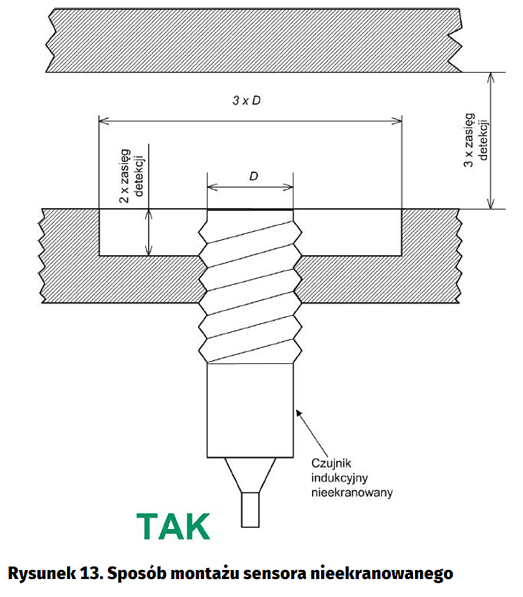 Czujnik nawet w wykonaniu ekranowanym, tj. z ukierunkowanym w stronę czoła polem magnetycznym, nie powinien być wpuszczany w otwór w taki sposób, że jego powierzchnia czołowa zagłębi się w nim (rysunek 12b). Oczywiście, w partykularnych przypadkach taki sensor zadziała, jednak ten sposób montażu znacznie ograniczy zasięg detekcji i czułość sensora.