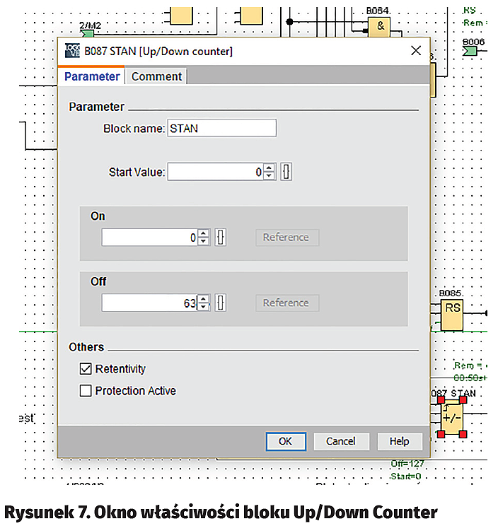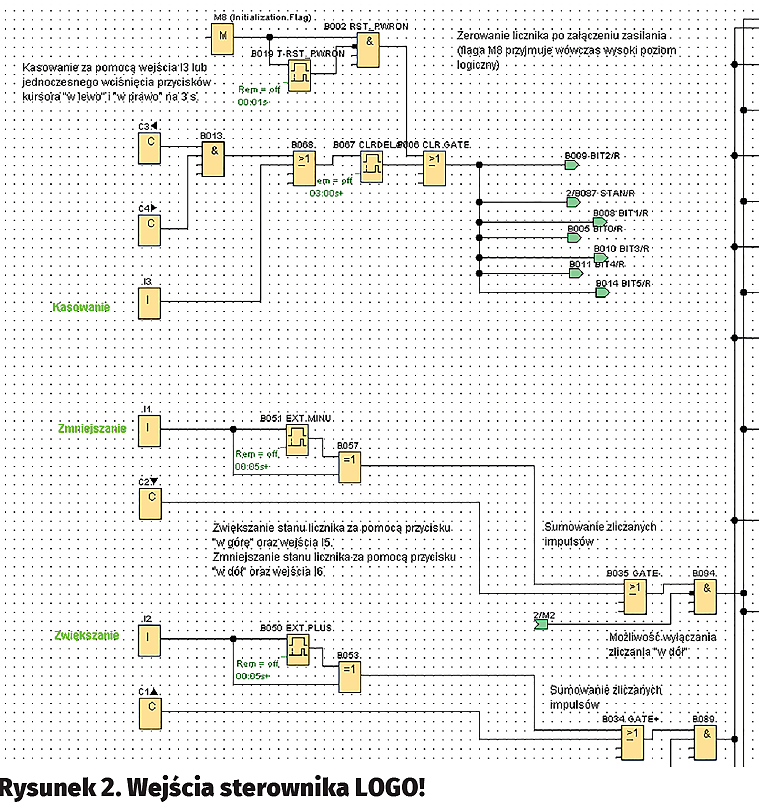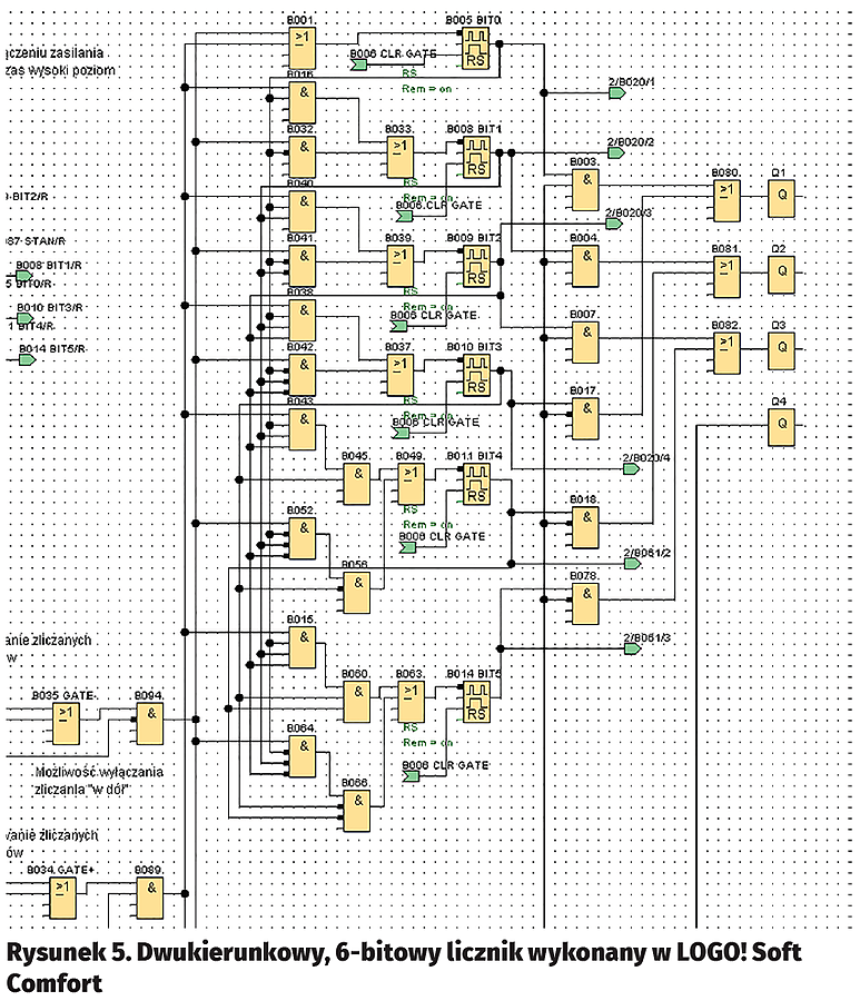 Środowisko LOGO! Soft Comfort ma bardzo funkcjonalne moduły liczników Up/Down Counter, z których można pobierać dane przez referencje. Dostępna jest w ten sposób cała zawartość licznika, a my dla potrzeb interfejsu musimy wydostać ją bit po bicie. Dlatego potrzebujemy wykonać licznik binarny z bramek i zaimplementować go w pamięci LOGO! Tu właśnie musimy cofnąć się do wiadomości z podstaw techniki cyfrowej.