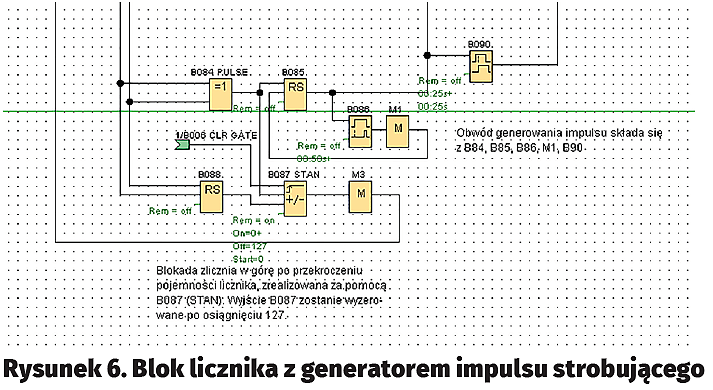 W pierwszym kroku musimy zdecydować się na jakiś protokół komunikacyjny służący do wymiany danych pomiędzy CPU a naszym modułem. Dla potrzeb tego przykładu wykonano licznik 6-bitowy oraz zdecydowano się na użycie LOGO! v6. Osoba chcąca zaadoptować program dla LOGO! v7 lub v8 nie będzie z tym miała najmniejszego problemu – wystarczy, że załaduje program do środowiska LOGO! Soft Comfort i po naciśnięciu „Ctrl+H” (Select Hardware) wskaże nowy typ sterownika. Program sprawdzono ze sterownikami mającymi wyjścia tranzystorowe i przekaźnikowe z tym, że w wypadku tych drugich konieczne było wydłużenie czasów tworzonych przez timery B086 i B090 o około 1 sekundę (przy zachowaniu warunku, że B086 jest dłuższy od B090), aby przekaźnik zdążył zewrzeć i rozewrzeć styki. W praktyce LOGO! z przekaźnikami nadaje się w tej aplikacji jedynie do testów, ponieważ częste załączanie/wyłączanie przekaźników może spowodować ich szybkie zużycie się – pamiętajmy, że mają one ograniczoną liczbę cykli załączenia. Dodatkowo, trzeba pamiętać o zasilaniu jednego z zestyków przekaźników, aby załączał on napięcie +24 V DC.