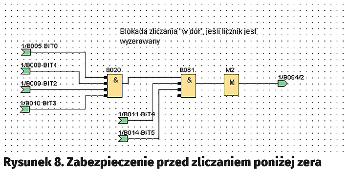 Jak pamiętamy, musimy jeszcze zabezpieczyć licznik przed zliczaniem wartości poniżej 0. Tę funkcjonalność uzyskano za pomocą bramek B020 i B061 (rysunek 8). Połączone funktory AND tworzą bramkę, na której wyjściu jest dostępna „1” logiczna, jeśli wszystkie wejścia są wyzerowane. Te wejścia dołączono do wyjść poszczególnych bitów licznika, a jej wyjście poprzez flagę M3 jest doprowadzone do zanegowanego wejścia bramki AND (B094) włączonej na wejściu „–”.