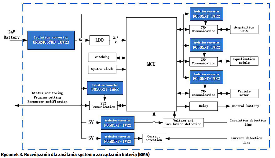 Stabilizator LDO obniża napięcie 5 V DC do 3,3 V do zasilania głównego modułu sterowania (MCU). W całym systemie wykorzystuje się 6 przetwornic F0505XT-1WR2, które są używane do zasilania 4 modułów CAN, obwodu wykrywającego napięcie, obwodu mierzącego rezystancję izolacji, obwodu detektora prądu. Jednocześnie wspomniane przetwornice zapewniają bezpieczną izolację galwaniczną pomiędzy obwodami zasilającymi wysokiego napięcia a obwodami sygnałowymi, włączając w to moduły interfejsowe. Wykorzystywane są też do zredukowania zaburzeń EMI oraz polepszenia stabilności pracy całego układu.