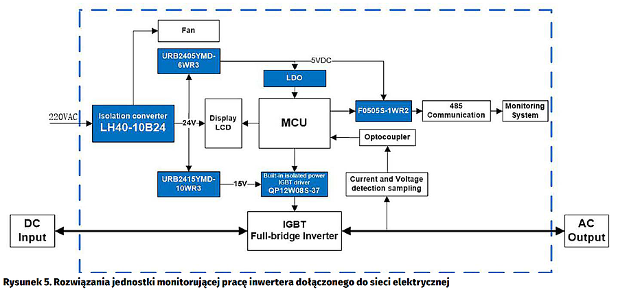 Schemat takiego systemu pokazano na rysunku 5. Konstruktor dobierający przetwornicę AC/DC dla danego systemu powinien przede wszystkim wziąć pod uwagę wartość napięcia zasilającego główną płytę sterującą i wentylator. W opisywanym systemie zapotrzebowanie na moc wynosi powyżej 15 kW. Przetwornica AC/DC LH40-10B24 dostarcza napięcie wyjściowe 24 V. Jest ona polecana do zasilania wentylatora oraz głównego układu sterującego. Dodatkowo, dla głównego układu sterującego jest zalecane użycie przetwornicy DC/DC R3 URB2415YMD-10WR3, która idealnie nadaje się do zasilania sterownika IGBT oraz URB2405YMD-6WR3 do zasilania głównego modułu sterowania (MCU) i modułu komunikacji.
