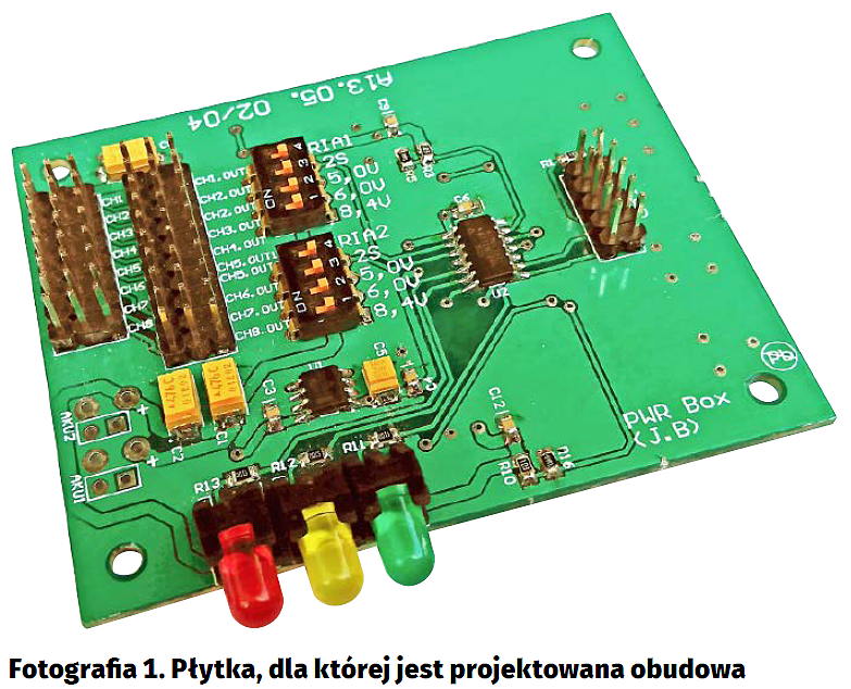 Obudowa zaprojektowana przeze mnie dla potrzeb tego artykułu jest bardzo prosta, podobnie jak jej przeznaczenie – jej zadaniem jest jedynie osłonienie zabezpieczenie komponentów zamontowanych na płytce przed przypadkowym dotknięciem. Nic nie stoi jednak na przeszkodzie, aby wykonywać bardziej skomplikowane obudowy, z innych materiałów (np. ABS), mające żebra wzmacniające, otwory na śruby mocujące pokrywę (lub pokrywy), miejsca do zamocowania złącz itp.
