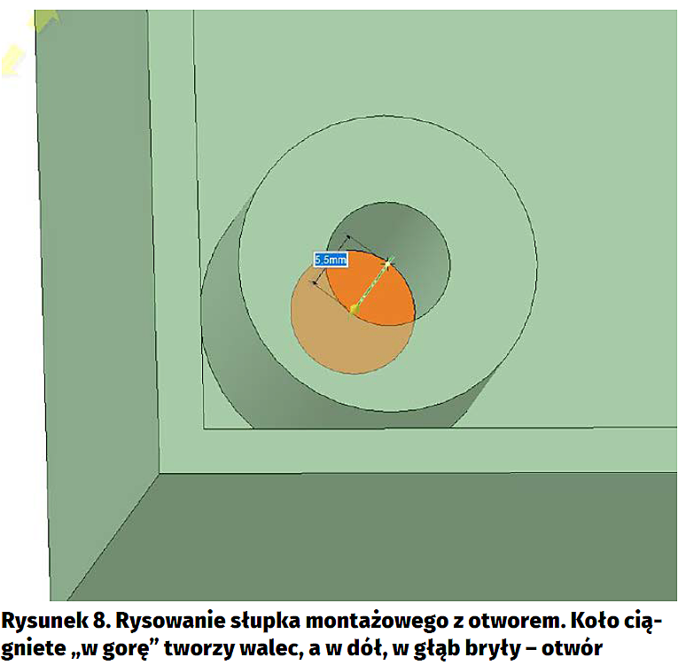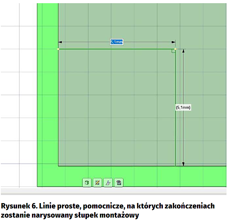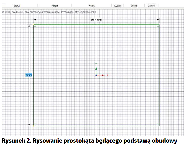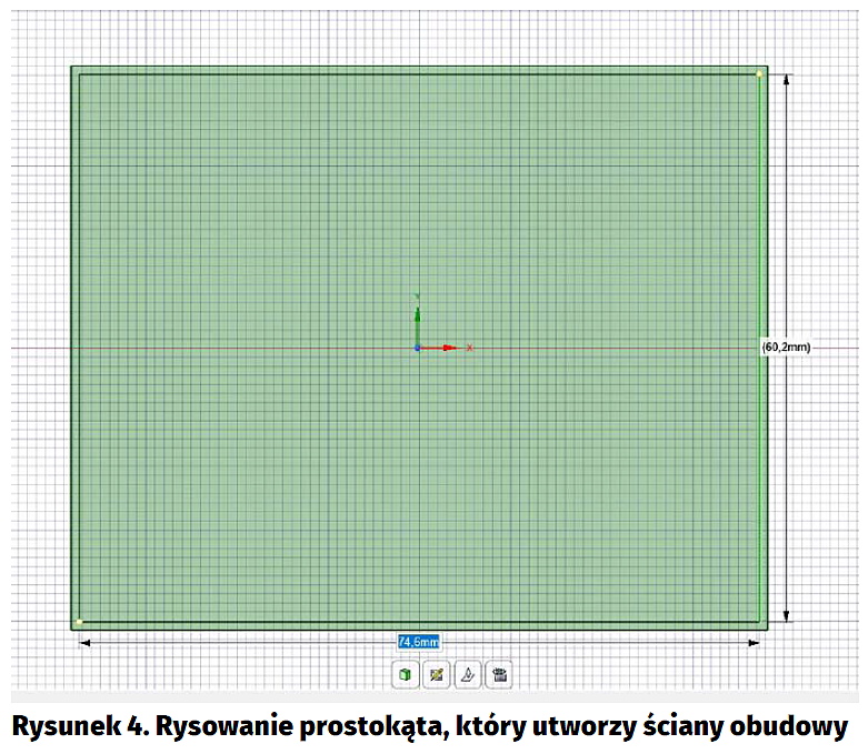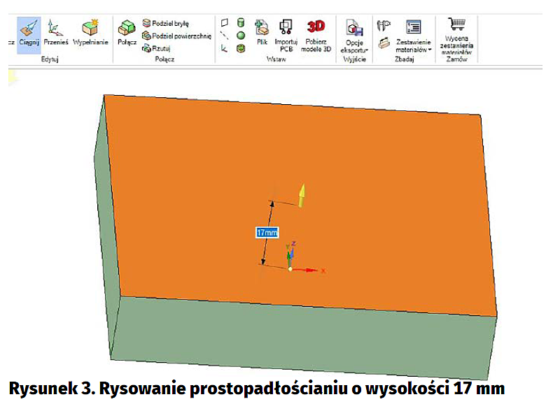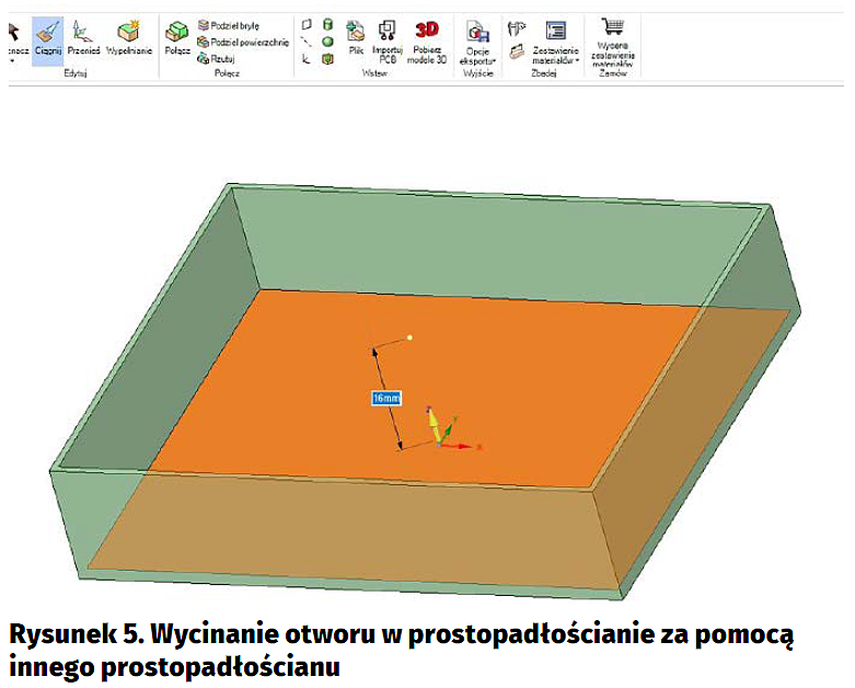 Wróćmy do naszego prostopadłościanu. Ścianki obudowy mają mieć grubość 0,9 mm, a jak pamiętamy nasza podstawa jest większa o grubość ścianek (0,9 mm) plus wolna przestrzeń (0,1 mm) od wymiarów płytki drukowanej. Aby „wybrać” przestrzeń dla płytki również posłużymy się narzędziem „Ciągnij”. Zaznaczamy górną powierzchnię prostopadłościanu i ponownie wybieramy „Widok Planu” „Tryb Szkicu”. Teraz rysujemy prostokąt o wymiarach o 0,1 mm większych z każdej strony płytki (rysunek 4). Wybieramy narzędzie „Ciągnij”, wskazujemy narysowany prostokąt i „ciągniemy” go w stronę wnętrza prostopadłościanu na głębokość 16 mm, jak pokazano na rysunku 5. Jak łatwo zauważyć, płaski obiekt „ciągnięty” do wnętrza figury wybiera z niej materiał, natomiast „ciągnięty” w stronę pustej przestrzeni dodaje materiał i tworzy figurę przestrzenną. W ten nieskomplikowany sposób, zależnie od kierunku ciągnięcia, możemy na przykład albo utworzyć walec, albo wykonać otwór w kształcie walca w bryle geometrycznej.