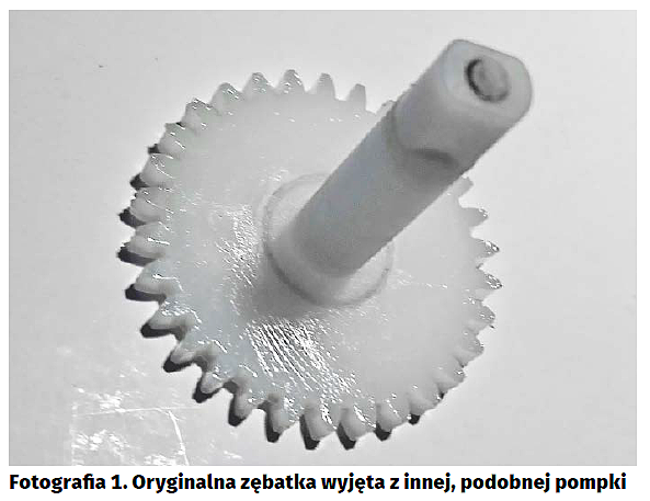 Dobrym przykładem zastosowania takiej zębatki wykonanej z PLA lub Nylonu jest problem, przed który kiedyś stanął autor artykułu – w pompce ręcznej ułamała się korbka, która była przymocowana do osi zębatki. Raczej nikt nie naprawia pompek tego typu, więc części zamienne nie są dostępne. Próba naprawiania oryginalnej zębatki skończyła się fiaskiem – połączenie klejone nie wytrzymało i korbka po prostu ukręciła się. Co prawda, pompka nie jest bardzo droga, ale trudno mi się było pogodzić z filozofią „zepsułeś, to nie naprawiaj, tylko wyrzuć i kup nową”.