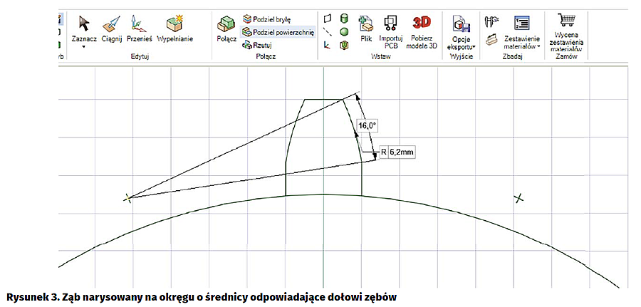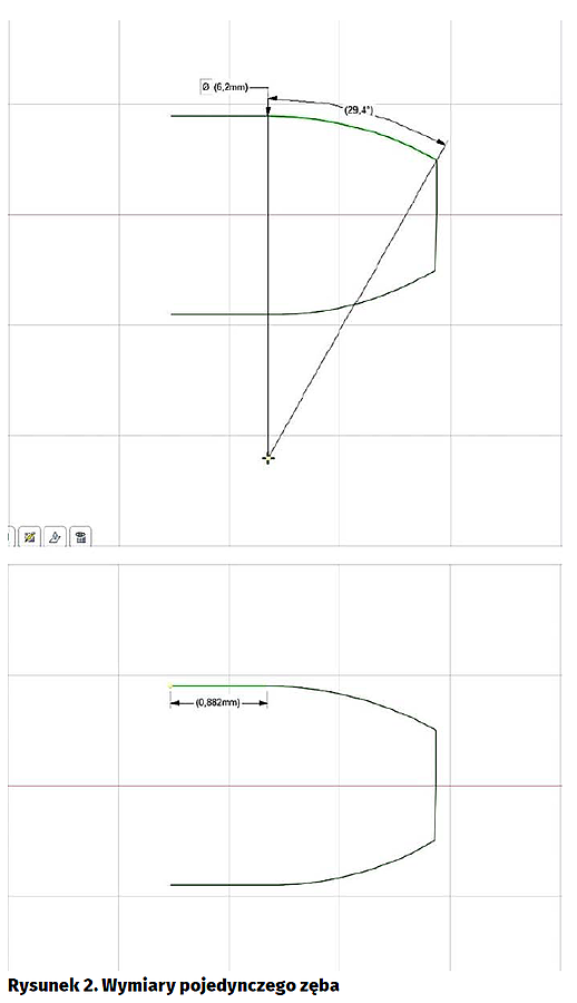 Rysowane przeze mnie koło zębate miało 30 zębów o kształcie zbliżonym do łuku. Zmierzyłem wysokość zęba i jego szerokość, a następnie aproksymowałem ten łuk jako odcinek prostej o długości 0,9 mm oraz łuk o promieniu 6,2 mm narysowany za pomocą funkcji „Łuk z trzech punktów” (zaznaczamy początek, koniec, ręcznie wpisujemy promień). Pojedynczy ząb pokazano na rysunku 2, a osadzony na powierzchni koła na rysunku 3. Potraktujemy go w funkcji wzorca do powielenia.