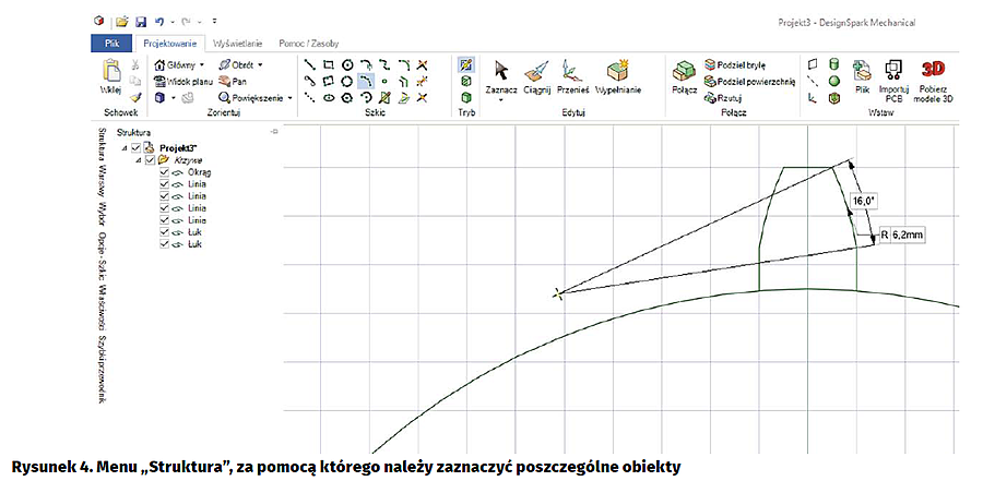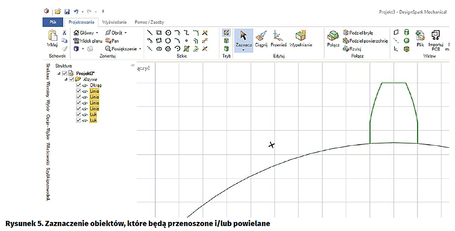 Kursorem myszki pokażmy menu „Struktura” po prawej stronie ekranu, jak na rysunku 4. Jak możemy zauważyć, nasz obiekt składa się z okręgi, dwóch łuków oraz czterech prostych. Pokazując myszką poszczególne elementy na ekranie komputera zaobserwujemy zmianę ich koloru, co ułatwia orientację. Trzymając wciśnięty klawisz Ctrl, za pomocą kliknięć myszki zaznaczamy elementy składowe zęba. Spowoduje to zmianę ich koloru na zielony (rysunek 5). Następnie z menu programu wybieramy funkcję „Przenieś”. W związku z tym, że narysowany ząb będzie powielany po okręgu, trzeba określić środek, wokół którego będzie obracany i kopiowany.
