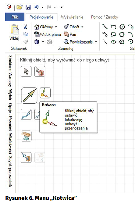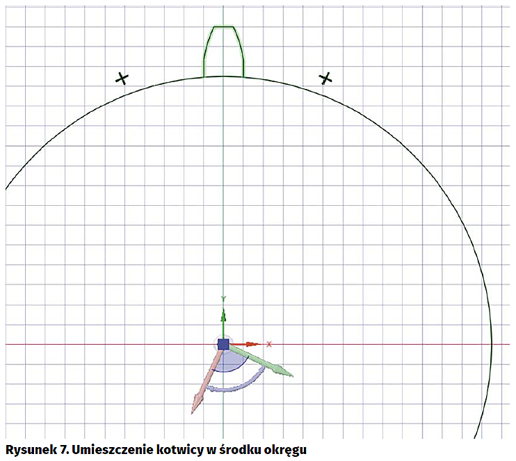 Po wybraniu funkcji „Przenieś”, po lewej stronie ekranu zostanie wyświetlone menu pomocnicze, z którego wybieramy ikonę „Kotwica” (rysunek 6). Wskazujemy środek okręgu, na którym będziemy umieszczali zęby. W wyniku tego działania punkt zaczepienia (obrotu) zostanie przeniesiony, jak pokazano na rysunku 7. Teraz już możemy przenosić po okręgu narysowany przez nas ząb, ale co z jego powielaniem? Wskazujemy menu lewej stronie ekranu i wybieramy „Opcje”. Zaznaczamy jedną z wyświetlonych opcji, to jest „Utwórz szyki” (rysunek 8. Nie wiem jak brzmiała nazwa tej opcji w oryginale, ale jej tłumaczenie na język polski jest kuriozalne, ponieważ jej zaznaczenie powoduje powielenie zaznaczonego obiektu zadaną liczbę razy. Co to ma wspólnego z szykiem, który raczej jest kojarzony jako formacja np. oddziału wojskowego? No i jeszcze ta liczba mnoga… Pozostawmy jednak wątpliwości językowe.