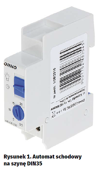 Coraz częściej daje się zauważyć, że w budynkach montowane są urządzenia do automatycznego wyłączania oświetlenia po zadanym czasie. Przykładem jest automat schodowy, który po użyciu przycisku oświetlenia klatki schodowej, włącza oświetlenie na zadany wcześniej czas np. 5 minut. Można w tym celu stosować gotowe moduły na szynę DIN35, np. ORNO pokazany na rysunku 1, lub zestaw do samodzielnego montażu, pokazany na rysunku 2.