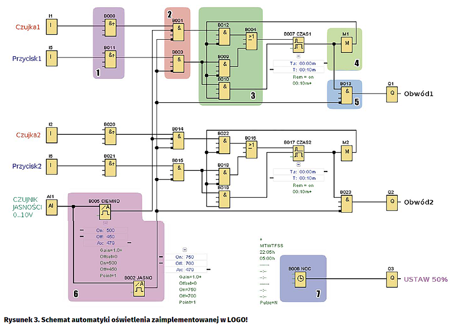 Zatem zbudujmy przykładowy układ dla dwóch identycznych obwodów oświetlenia, które będą miały wspólną konfigurację. Na rysunku 3 przedstawiono kompletny schemat logiki sterującej. Widać wyraźnie dwa identyczne segmenty złożone z dwóch wejść i jednego wyjścia oraz bloków od 1 do 5. Oba segmenty pobierają informacje z bloku nr 6, który na początek omówimy. Składa się on z dwóch identycznych elementów typu Analog treshold trigger, których zadaniem jest wykrywania określonego progu jasności otoczenia. Mają one wbudowaną histerezę, dzięki której uzyskamy stabilne sygnały osiągnięcia progu jasności. Element B005 informuje automatykę, że otoczenie osiągnęło jasność, przy której użytkownik może sam podjąć decyzję o tym, czy chce włączyć oświetlenie. Brak tego sygnału aktywuje pełną automatykę. Element B002 informuje automatykę, że jasność otoczenia przekroczyła próg najwyższej jasności, co skutkuje całkowitym zablokowaniem oświetlenia zarówno w wersji automatycznej, jak i ręcznej. Powyższe dwa sygnały są doprowadzone do obu segmentów do bloku 2 będącego bramą dla impulsów z bloku 1 formującego sygnały z wejść do postaci jednego impulsu. Zależnie od jasności otoczenia, blok 2 przepuszcza właściwy sygnał do bloku 3, który podejmuje decyzję o tym, czy włączyć oświetlenie czy wyłączyć. Do podjęcia decyzji jest potrzebna informacja z bloku nr 4, który zawiera marker. Dzięki markerowi możemy zawrócić informacją z wyjść bloków na ich wejścia. Bez markerów jest to niemożliwe.
