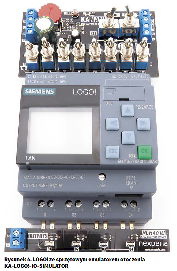 Do testów układu użyjemy sprzętowego symulatora otoczenia KA-LOGO!-IO-SIMULATOR (rysunek 4), dzięki któremu łatwo możemy „regulować” jasność otoczenia, używając potencjometru lub zasłaniając wbudowany fotorezystor. Przedstawiony układ można rozbudować o kolejne obwody oświetleniowe. Jeśli planujemy zbudować oświetlenie klatki schodowej, możemy dodać obsługę oświetlenia przed wejściem jako dodatkową sekcję w ramach obwodu.
