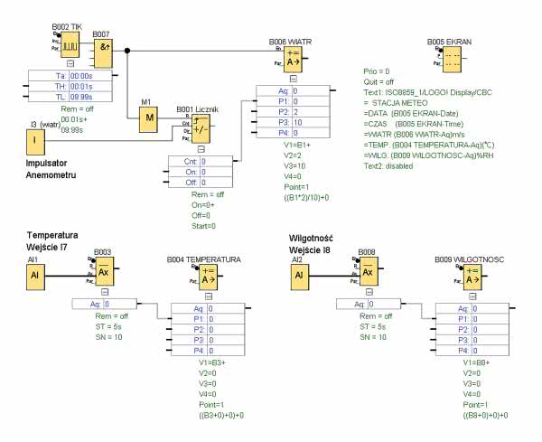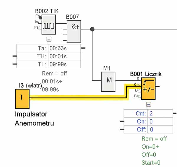 Nieco szerszego omówienia wymaga układ pomiaru prędkości wiatru, na który składają się bloki B001, B002, B006, B007 oraz M. Jest to typowy układ miernika częstotliwości, podobnie jak prędkościomierza rowerowego. Jako układ impulsatora możemy użyć dowolnego gotowego anemometru lub zbudować własny, w oparciu o dowolny enkoder z jak najmniejszą liczbą impulsów na obrót. Możemy również zbudować własny impulsator na bazie diody emitującej podczerwień oraz odbiornika podczerwieni, przesłanianych dowolną tarczką z otworami. Zadaniem naszego układu pomiarowego jest zliczanie impulsów z anemometru (wejście I3) w określonym cyklu (B002), a następnie przeliczenie wyniku pomiaru na prędkość wyrażoną w m/s.