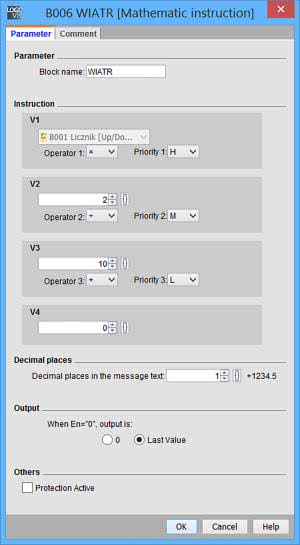 Aby wykonać takie obliczenia, wartość uśrednioną podajemy na blok B004, którego zadaniem jest wykonanie wskazanych obliczeń matematycznych. Wartość uśredniona jest wprowadzona jako parametr V1. Kolejne pola wraz z poprzedzającymi je operatorami działań matematycznych tworzą wyrażenie, które będzie nieustannie przeliczane. Wynik tych obliczeń będzie aktualizowany na wyświetlaczu. Warto zauważyć, że nie trzeba, a wręcz nie należy, wykonywać dzielenia przez 10, aby uzyskać wynik z przecinkiem. LOGO! wykonuje operacje na liczbach całkowitych i wynik dzielenia 4/10 wyniesie 0 zamiast spodziewanego 0,4. Dlatego w bloku matematycznym znajduje się sekcja [Decimal Places], która informuje sterownik o tym, gdzie należy pokazywać przecinek. Dzięki temu na ekranie zobaczymy wynik „19.4”, gdy z obliczeń wyjdzie nam liczba całkowita 194. Sekcja pomiaru wilgotności pracuje identycznie jak pomiar temperatury z tą różnicą, że dane pomiarowe pobiera z wejścia AI2, czyli fizycznego I8.