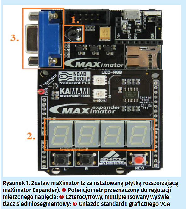 - czteropozycyjny, multipleksowany wyświetlacz siedmiosegmentowy (zawarty na płytce rozszerzającej zestaw maXimator tj. maXimator Expander),