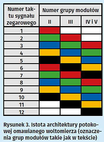 Podstawową ich cechą jest w pełni synchroniczna praca, tj. taka, która opiera się o zbocza sygnałów zegarowych do nich doprowadzonych (innymi słowy: funkcjonalność modułów realizowana jest wraz z każdym kolejnym taktem wspomnianych sygnałów, przy czym momentem ją wyzwalającym są zbocza tych taktów, domyślnie narastające (przejścia od ich stanów niskich do wysokich). Tym samym również i woltomierz jest w pełni synchroniczny, co przekłada się bezpośrednio na jego architekturę, która jest potokowa (ang. pipeline). Jej istotą jest fakt, że moduły będące w stosunku do siebie następującymi po sobie stopniami pojedynczego potoku (którym jest woltomierz) wykonują w tym samym czasie własne zadania, bazując na danych pochodzących z modułów wcześniej występujących. Czynią to w sposób przedstawiony na rysunku 3.