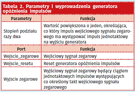 Drugi element to nic innego jak generator impulsów o stałej szerokości, równej pojedynczemu taktowi wejściowego sygnału zegarowego. Impulsy te tworzone są co określony takt tegoż sygnału. Tym samym również co określony takt generowane są ich zbocza narastające, co z kolei przekłada się na obecne w nazwie modułu opóźnienie (im szybciej się one pojawiają, tym więcej czynności w określonej jednostce czasu jest w stanie wykonać dany moduł, im rzadziej natomiast, tym mniej). Jest to podejście równoważne dzielnikowi częstotliwości (preskalerowi), przy czym różnicą w stosunku do niego jest brak zapewnienia wypełnienia taktów wyjściowego sygnału zegarowego na poziomie 50% (nie jest to jednak tu istotne – w stosunku do opóźnienia bowiem liczą się jedynie wspomniane zbocza, a nie poziomy i czas trwania taktów sygnału zegarowego. Tym samym możliwe staje się zaniedbanie tego parametru i zastosowanie w sposób wystarczający jednotaktowych impulsów). Bez względu jednak na to, w stosunku do pętli PLL generator opóźnień impulsów jest modułem parametryzowanym tzn. takim, w którym w zależności od potrzeb można ustalić wartości wybranych jego wielkości (zwanych parametrami). Wielkości te (wraz z sygnałami omawianego modułu) przedstawiono w tabeli 2.
