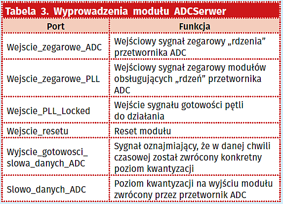 Jak można zauważyć są tu jak najbardziej obecne sygnały wymienione przy okazji omawiania pętli PLL, a także oprócz nich sygnały związane ze zwracanymi przez moduł poziomami kwantyzacji, oznajmiające ich zwrot i resetujące sam moduł (w przypadku ostatniego z nich występuje na stałe poziom wysoki, zapewniający ciągłą pracę przedstawionego modułu).