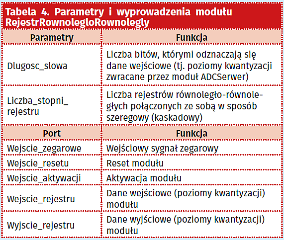 Drugi z modułów natomiast odpowiedzialny jest za zwracanie jedynie wybranych poziomów kwantyzacji. Nie chodzi jednak o świadome ingerowanie w zwracane wyniki, a pomijanie zbyt dużej ich ilości (zgodnie z wcześniejszym opisem przetwornik zwraca aż milion poziomów w ciągu sekundy, co sprawia, że zmieniają się one nadzwyczaj szybko i nie jest możliwe sensowne ich odczytanie). Tym samym realizuje on proces zwany decymacją, w oparciu o prosty rejestr równoległo-równoległy (PIPO), pod wpływem jednotaktowych impulsów wytwarzanych przez pierwszy z trzech wspomnianych wcześniej generatorów opóźnień impulsów. W tabeli 4 przedstawiono parametry i sygnały omawianego modułu.