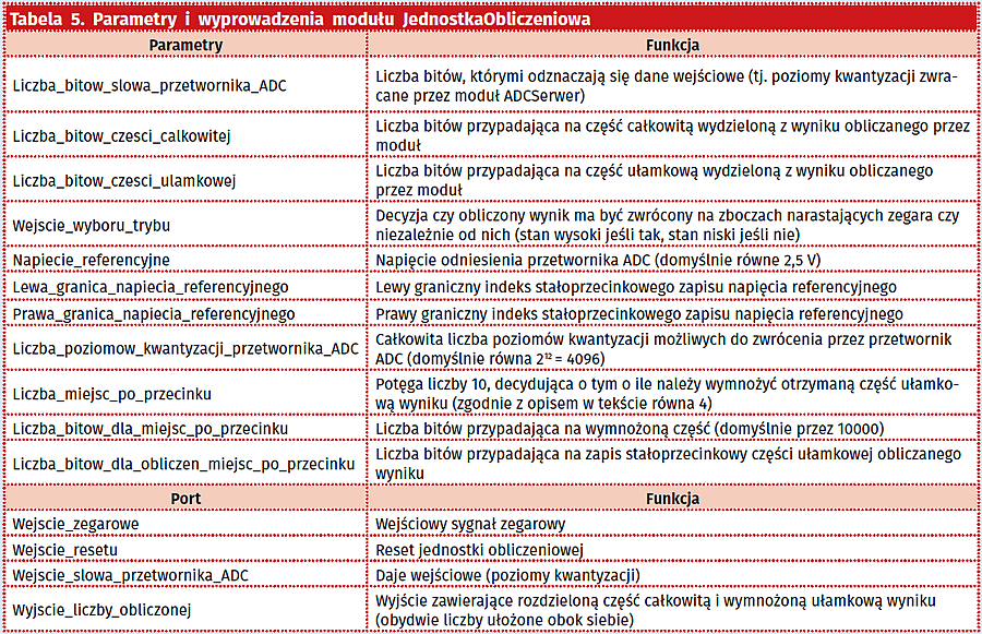 Wzór ten (pochodzący z oficjalnej dokumentacji przetwornika, dostępnej na stronie pod adresem: https://goo.gl/uMHK8B, strony 9 i 10) wyznaczany jest w oparciu o logikę stałoprzecinkową, przy czym na część całkowitą przeznaczone są 2 bity (ze względu na fakt, że maksymalne mierzone napięcie wynosi 2,5 V, a tym samym maksymalną liczbą jego części całkowitej jest liczba 2, wymagająca do opisu jedynie dwóch bitów – 2 bowiem w zapisie binarnym to „10”), natomiast na część po przecinku łącznie 66 bitów (jest to ilość pozwalająca w sposób praktycznie jednoznaczny (z pomijalnie małym błędem) na zapisanie części ułamkowej dowolnej liczby, z dokładnością równą 1·10-4). Tym samym użytych jest łącznie 68 bitów, co wbrew pozorom nie jest znacząco dużą liczbą (jest to zarazem uzasadnienie zastosowania logiki stałoprzecinkowej zamiast zmiennoprzecinkowej, która z natury wymaga do zapisu mniejszej ilości bitów). Niezależnie jednak od tego wyznaczany w ten sposób wynik rozdzielany jest na dwie odrębne liczby – jedną obejmującą część całkowitą wyniku oraz drugą obejmującą jej część ułamkową. O ile w pierwszym przypadku wystarczające jest odrzucenie części ułamkowej wyniku, o tyle w drugim poza odrzuceniem jego części całkowitej konieczne jest jeszcze przemnożenie jego części całkowitej przez 10000, dzięki czemu możliwe jest jej potraktowanie jako łatwiejszej w operowaniu liczby całkowitej (jak można zauważyć będzie to zawsze liczba rzędu 103, co da w ostateczności wynik pomiaru określony z dokładnością do 1·10-4 V). W tabeli 5 przedstawiono parametry oraz sygnały modułu.