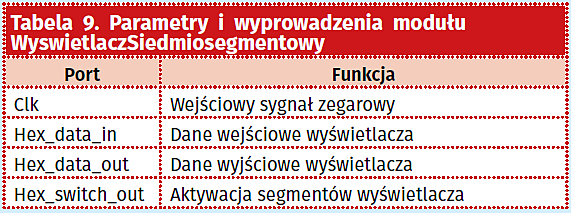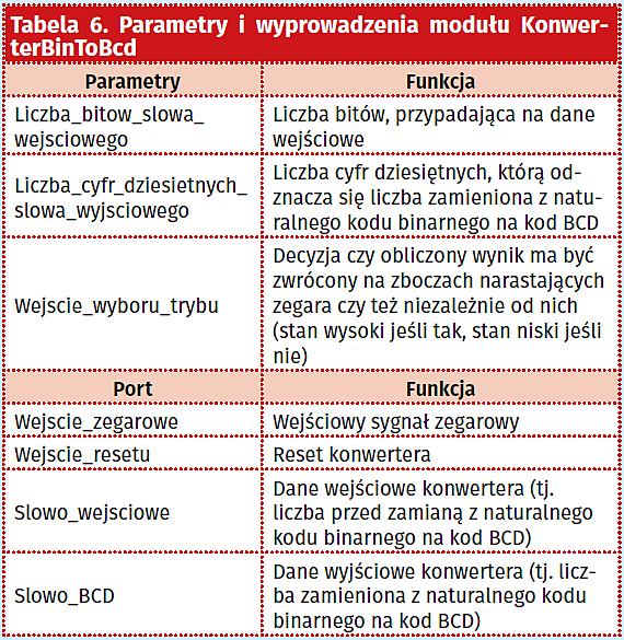 Niezależnie od tego zarówno rozdzielona część całkowita wyniku, jak i jego rozdzielona część ułamkowa wyrażone są w naturalnym kodzie binarnym, co nie jest wygodnym sposobem ich dalszej prezentacji. W związku z tym wymagają one zamiany na wygodniejszą postać, przy czym najlepszym tu rozwiązaniem jest ich zamiana na kod BCD wyrażający każdą dowolną liczbę dziesiętną w postaci ciągu cyfr dziesiętnych, które je budują, a które to zapisane są odrębnie w postaci binarnej. Zadanie to realizuje drugi z przytoczonych modułów, realizując prosty algorytm przesuwania liczby wyrażonej w naturalnym kodzie binarnym i dodawania trójki do każdej tetrady bitów liczby konwertowanej, gdy jest ona równa co najmniej 5 (wyjaśnienie algorytmu można znaleźć na stronie pod adresem https://goo.gl/fFMWe9). Parametry oraz sygnały przedstawionego modułu zawiera tabela 6.