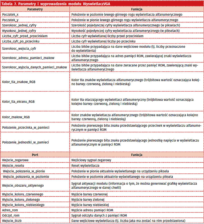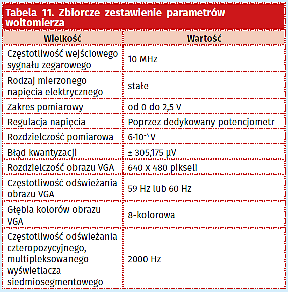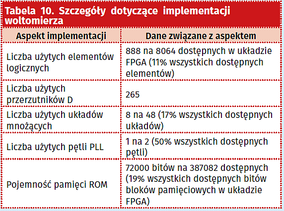 Szczegóły dotyczące implementacji woltomierza zawarto w tabeli 10, natomiast w tabeli 11 umieszczono zbiorcze zestawienie parametrów woltomierza.
