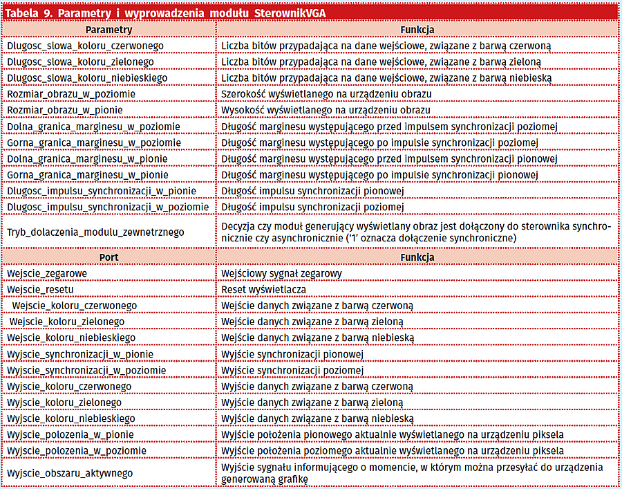 W celu ich spełnienia (zwłaszcza dwóch pierwszych) omawiany moduł funkcjonuje w oparciu o sygnał zegarowy o częstotliwości równej 25 MHz, która to pozyskiwana jest z sygnału zegarowego o częstotliwości równej 50 MHz, z zastosowaniem drugiego z przedstawionych wcześniej generatorów opóźnień impulsów (jak można zauważyć generacja jednotaktowych impulsów co drugi impuls wejściowego sygnału zegarowe jest tożsame z zastosowaniem dzielnika częstotliwości (preskalera) przez dwa – stąd też wynika pierwotnie użyta nazwa parametru związanego ze stopniem podziału)). Co więcej pierwsze dwa parametry zostały dobrane arbitralnie (według uznania autora), przy czym w przypadku drugiego z nich nie chodzi o możliwość wyboru wymienionych przy nim wartości przez użytkownika – zamiast tego chodzi o wspomniany już sygnał zegarowy o częstotliwości równej 25 MHz, która w rzeczywistości jest zaokrąglona i nie jest w pełni zgodna z oficjalnymi wartościami przewidzianymi dla rozdzielczości 640×480 pikseli (w praktyce bowiem potrzebny jest sygnał zegarowy o częstotliwości 25,175 MHz, który nie jest łatwy w uzyskaniu, nawet za pomocą pętli PLL). Tym samym niektóre urządzenia wyświetlające mogą pod jej wpływem różnie po prostu zinterpretować częstotliwość odświeżania obrazu (nie ma to jednak większego znaczenia, szczególnie, że po pierwsze ludzkie oko nie dostrzeże różnicy, a po drugie natomiast większość współczesnych urządzeń radzi sobie bez problemu zarówno z jedną, jak i z drugą częstotliwością odświeżania obrazu)). Ostatni z parametrów natomiast ma związek z tym, że w zestawie maXimator obecny jest trzybitowy przetwornik, dołączony do gniazda standardu VGA (sprawia to, że każdą z barw przestrzeni RGB przypada wyłącznie jeden bit, co w sumie daje 23 = 8 możliwych do otrzymania kolorów). W tabeli 9 przedstawiono parametry i sygnały związane ze sterownikiem.