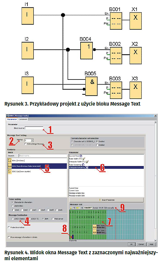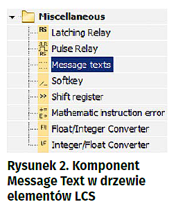 Na rysunku 2 pokazano położenie elementu Message Text w gałęzi bloków dostępnych w aplikacji Logo Soft Comfort. Blok ten, użyjemy do zbudowania schematu przedstawionego na rysunku 3.