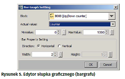 Rysunek 5 przedstawia edytor słupka graficznego (bargrafu). Po wybraniu bloku z projektu wskazujemy parametr, który będzie prezentował aktualną wartość dla słupka. Możemy również zmienić domyślne graniczne wartości, które pokazuje słupek. W dolnej części okna ustawiamy czy potrzebujemy słupek pionowy czy poziomy oraz jaki on ma mieć rozmiar, wyrażony w ilości kratek/wierszy, które zajmie na ekranie.