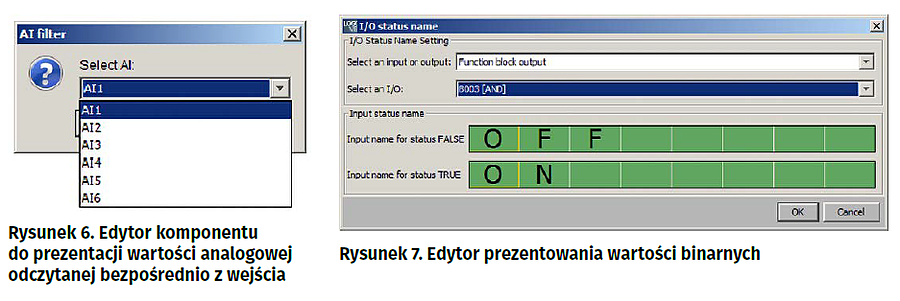 Rysunek 7 prezentuje bardzo przydatny blok prezentowania wartości binarnych, których w programach jest zawsze wiele. Pozwala on na pobranie wartości binarnej z dowolnego punktu programu, nawet z wyjścia bramki lub bezpośrednio z wejścia czy stan kursora. Oba stany możemy dowolnie opisać. Dzięki temu możemy wizualizować np. włączony silnik, zamknięty zawór, aktywny alarm i wiele innych sytuacji.