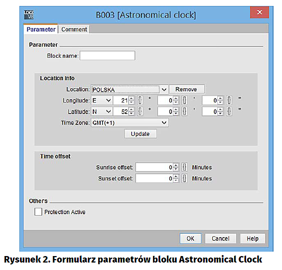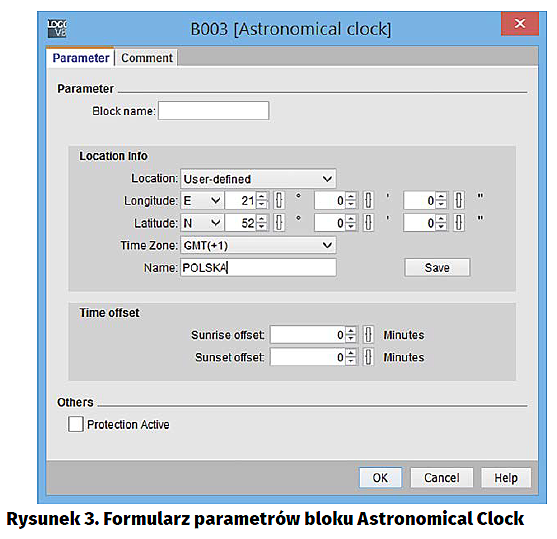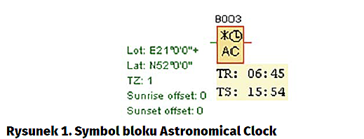 Jednym z bardziej skomplikowanych obliczeń jest wyznaczanie godzin wschodu i zachodu Słońca w zależności od daty, godziny oraz położenia geograficznego. To ważna informacja, na której możemy opierać wiele codziennych czynności wykonywanych automatycznie bez stosowania czujników jasności. Dla przykładu, możemy w lato zwijać rolety czy żaluzje, otwierać okiennice itp. W LOGO! do określenia momentu wschodu i zachodu Słońca służy blok funkcyjny „Astronomical Clock” pokazany na rysunku 1. Podczas pracy bloku widać wyliczoną godzinę wschodu (TR) oraz zachodu (TS) Słońca, które są podane według czasu lokalnego, czyli z uwzględnieniem strefy czasowej.