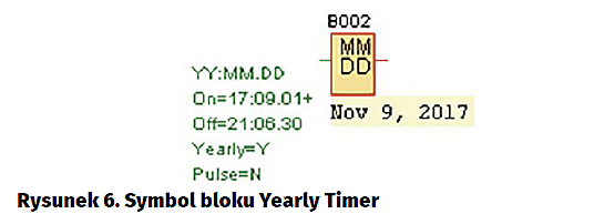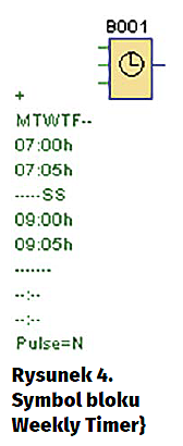 Blok funkcyjny „Weekly Timer”, którego symbol pokazano na rysunku 5 znakomicie pomoże nam w zautomatyzowaniu czynności realizowanych w określone dni tygodnia. Można też powiedzieć, że ten blok przyda się, aby sterownik nie realizował określonych czynności np. w sobotę i niedzielę. Czyli wschód Słońca nie odsłoni nam rano żaluzji w sobotę i niedzielę, dzięki czemu będziemy mogli dłużej wypoczywać. Zrobi to, na przykład, 3 godziny później. Blok ten działa podobnie do „Astronomical Clock”, czyli podaje na wyjście logiczną „1”, gdy są spełnione określone warunki.