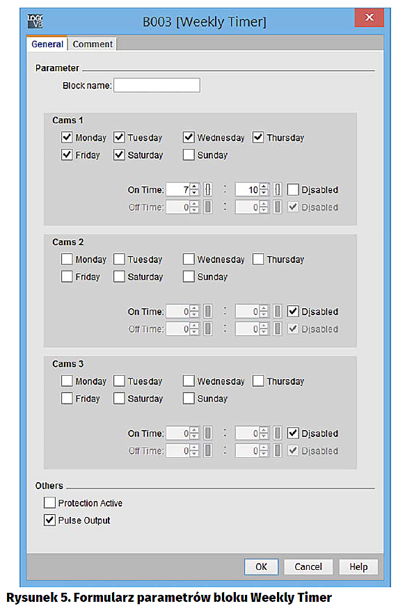 Na rysunku 5 pokazano formularz warunków, które aktywują wyjście bloku. Upraszczając, zaznaczamy tylko te dni tygodnia, w które chcemy coś wykonać i ustawiamy godzinę. W jednym bloku funkcyjnym mamy 3 harmonogramy tygodniowe. Każdy ma możliwość zdefiniowania niezależnie godziny włączenia i wyłączenia wyjścia z bloku. Może się wydawać to dziwnym ale, dzięki temu możemy włączyć wyjście z bloku w środę o 09:00 i wyłączyć w piątek o 12:30. Aby zrealizować takie zadanie, będziemy użyjemy dwóch harmonogramów w jednym bloku funkcyjnym. Blok funkcyjny „Weekly Timer” idealnie pasuje nam do uruchamiania porannych zadań, na przykład, przygotowania herbaty.