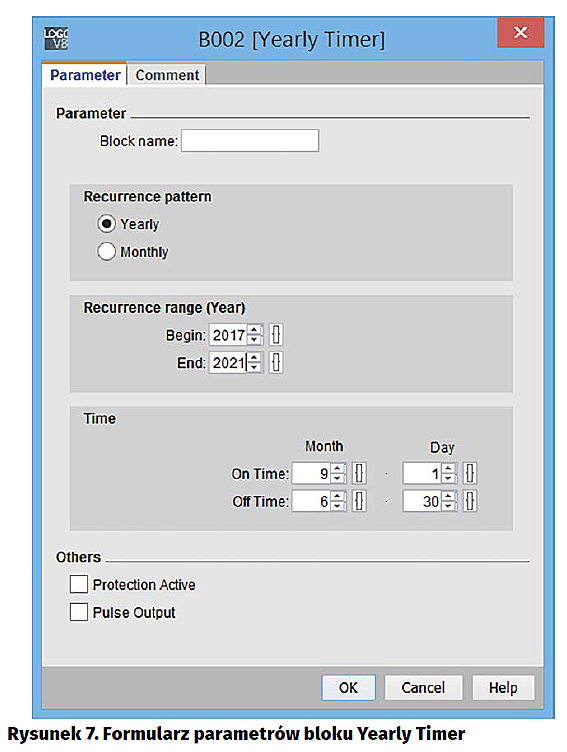 Poranna, zimowa herbatka jest inna niż wiosenna. Tak właśnie powinien działać nasz automat – zadbać, aby zaparzał nam inne herbatki zimą, a inne wiosną. Do tego celu użyjemy bloku „Yearly Timer”, którego zadania są podobne do „Astronomical Clock”, tylko w szerszym zakresie czasu. Yearly Timer jako parametry może przyjmować lata pomiędzy którymi ma działać oraz dni i miesiące graniczne. Dzięki temu możemy włączyć jakąś funkcję w dniu 22 września i wyłączyć ją w dniu 20 marca w kolejnym roku.