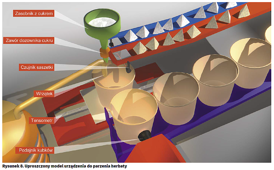Waga tensometryczna w naszym układzie stała się jednocześnie źródłem informacji o postępowaniu procesu przygotowania herbaty. Jeśli będziemy dysponowali wystarczająco czułymi tensometrami oraz odpowiednio dobranym układem mostka tensometrycznego wówczas, możemy nawet zrezygnować z czujnika saszetki. Badając zmianę wagi wykryjemy moment wrzucenia saszetki. Zasypanie cukru również możemy oprzeć nie o czas, lecz o zmianę wagi. Nasz układ możemy rozbudować o sygnalizator gotowości produktu lub o informacje dotyczące zapotrzebowania na cukier czy herbatę.