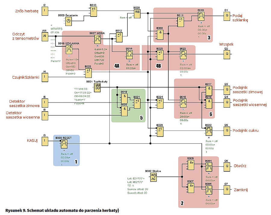 Nasze urządzenie jest już dosyć rozbudowane, potrafi wykonywać więcej niż jedna czynność w tym samym czasie a, niektóre czynności wykonuje w odpowiedniej kolejności. Może się zdarzyć, że zabraknie kubków, nie naleje się do końca wrzątek, zabraknie herbaty itd. Może się również zdarzyć, że pęknie szklanka podczas nalewania. Dlatego w naszym urządzeniu trzeba zadbać o bezpieczeństwo. W zaprezentowanym układzie można zauważyć, że sygnał odczytany z wagi jest przekazywany do dwóch przełączników analogowych, z których jeden – B015, ma wyjście skierowane do B029, a będące bramką sygnalizującą obecność szklanki. A zatem, jeśli szklanka się zbije, to większa część spadnie poza wagę, a ewentualnie nalany wrzątek się wyleje, co, spowoduje obniżenie ciężary poniżej progu [Off] w bloku B015, a tym samym wysłanie do reszty układu sygnału o braku szklanki. Sygnał o braku szklanki jest w naszym układzie traktowany jako krytyczny i służy do kasowania wszystkich istotnych bloków odpowiedzialnych za sterowanie wyjściami realizującymi określone funkcje. W tym przypadku kasowane są wszystkie układy czasowe sterujące podawaniem wrzątku, podawaniem saszetek oraz cukru.