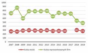Rysunek 9. Liczby stoisk wystawców i reprezentowanych przez nich firm na targach Automaticon w latach 2007-2019. W roku 2017 organizatorzy nie podali liczby stoisk