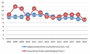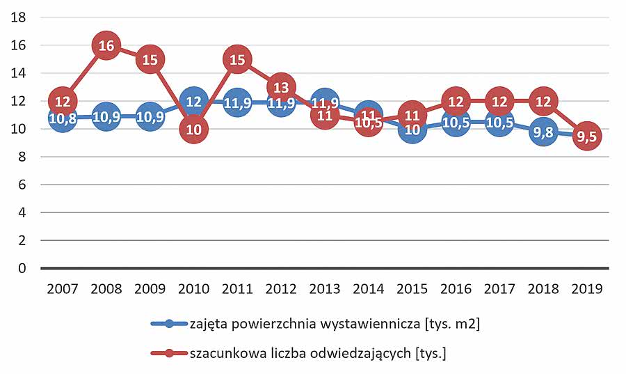 Rysunek 10. Zajęta powierzchnia wystawiennicza (w tysiącach metrów kwadratowych) i szacunkowe liczby gości odwiedzających targi Automaticon (w tysiącach) w latach 2007-2019