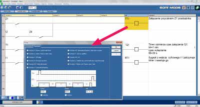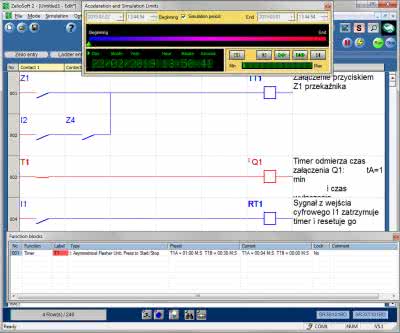 Na rysunku 3 przedstawiono przykład, w którym umieszczono na schemacie drabinkowym układ czasowy, którego zadaniem jest cykliczne włączanie i wyłączanie przekaźnika Q1. Czasy włączenia i wyłączenia są różne (odpowiednio 1 min oraz 30 s). Przedstawiony algorytm przewiduje uruchomienie timera przyciskiem nawigacyjnym Z1 lub jednoczesnym uaktywnieniem sygnału wejściowego I2 przy naciśniętym przycisku Z4. Sygnał z wejścia I1 w dowolnym momencie zatrzymuje i zeruje timer. Jak widać na rysunku 3, każda linia kodu może być uzupełniana komentarzem znacznie zwiększającym czytelność programu.