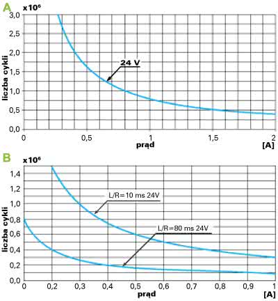 Rysunek 2. Wykresy żywotności styków przekaźnika SR 101BD w funkcji natężenia przełączanego prądu i stałej czasowej L/R,