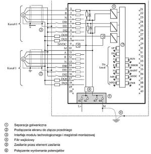 Do 40-stykowego złącza przedniego modułu technologicznego są doprowadzone sygnały enkodera, cyfrowe sygnały wejściowe i wyjściowe oraz zasilanie enkodera. Ponadto, napięcie zasilania, do zasilania modułu i wyjść cyfrowych, oraz generowania napięć zasilających enkodera, jest doprowadzone do 4-pinowego złącza zasilania.