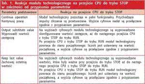 Tab. 1. Reakcja modułu technologicznego na przejście CPU do trybu STOP w zależności od przypisania parametrów