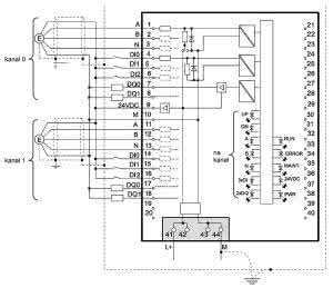 Schemat blokowy modułu technologicznego z dwoma podłączonymi enkoderami inkrementalnymi pokazano na rysunku 2. W każdej aplikacji należy uziemić ekrany kabli połączeń pomiędzy enkoderem a modułem technologicznym, przez podłączenie ekranu do złącza przedniego (przez zacisk i uchwyt ekranu) i do enkodera. Napięcie zasilania (DC 24 V) należy podłączyć do zacisków połączeniowych L+ (biegun dodatni) i M (masa). Wewnętrzny układ zabezpieczający chroni moduł technologiczny przed zmianą biegunowości napięcia zasilania. Moduł technologiczny monitoruje połączenie napięcia zasilania.