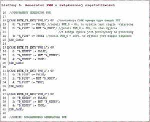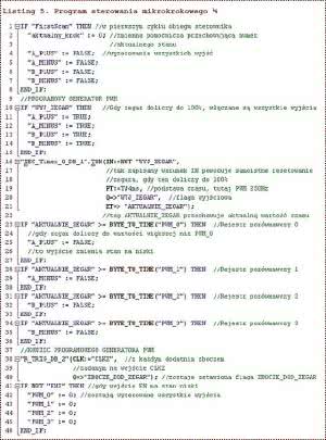 Program wygląda analogicznie do omawianych wcześniej, jedyną zmianą poza oczywiście implementacją generatora jest dodanie sekcji rozpoznającej poziomy prądu. Jednakże po wgraniu programu do sterownika powstaną problemy - mianowicie przy tak niskiej częstotliwości PWM wirnik silnika w położeniach pośrednich najprawdopodobniej będzie drgał. Konieczne jest zwiększenie częstotliwości PWM - co można uczynić na dwa sposoby: zmieniając podstawę czasu na T#2ms w podanym kodzie lub korzystając z rozwiązania bardziej sprytnego, pokazanego na listingu 6.
