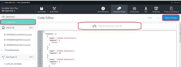 W projekcie Invisible Dice Plus wykorzystamy interfejs głosowy użytkownika z umiejętności niewidzialnej kostki do gry Invisible Dice. Najpierw jednak musimy utworzyć nową umiejętność. Uruchamiamy portal developera http://developer.amazon.com i tworzymy umiejętność użytkownika Custom Skill o nazwie Invisible Dice Plus. Postępujemy zgodnie z procedurą opisaną w pierwszej części kursu (rysunki 1…5). Następnie uruchamiamy kreator tworzenia interfejsu głosowego użytkownika Skill Builder. Po uruchomieniu kreatora wybieramy zakładkę Code Editor i importujemy plik z konfiguracją przygotowaną dla umiejętności niewidzialnej kostki do gry. Plik o nazwie IntentSchema.json jest dostępny w folderze projektu (EP 12/2017). Po wgraniu konfiguracji zatwierdzamy wprowadzone ustawienia (rysunek 1). Na zakończenie zapisujemy (Save Model) oraz kompilujemy (Build Model) nowo utworzony interfejs głosowy użytkownika (rysunek 2).