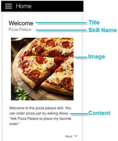 Tworząc umiejętności typu Custom (użytkownika) mamy możliwość definiowania karty domowej w konfiguratorze asystentki Alexa (konfigurator www dostępny pod adresem http://alexa.amazon.com oraz aplikacja na urządzenia mobilne Alexa app ). Możemy definiować tytuł karty, opis karty oraz wyświetlić grafikę powiązaną z kartą, jak na rysunku 3. Obrazy wyświetlane w karcie muszą być w jednym z formatów JPEG, PNG. Każdy obraz musi być przygotowany w dwóch rozdzielczościach: „małym”, o wymiarach 720×480 pikseli oraz „dużym” o wymiarach 1200×800 pikseli.