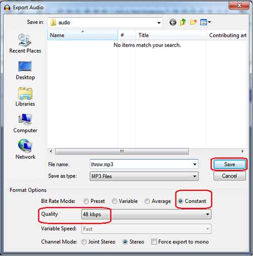 Aby plik audio był poprawnie odtwarzany, musi być zapisany w formacie mp3 (kodek MPEG2), z przepływnością 48 kb/s, przy szerokości pasma 16 kHz. Nie może przy tym trwać dłużej niż 90 sekund. Do konwersji pliku do formatu akceptowanego przez mechanizm SSML możemy użyć darmowego oprogramowania Audacity. W tym celu logujemy się na stronie projektu http://audacityteam.org, pobieramy i instalujemy oprogramowanie. Następnie ze strony http://lame.buanzo.org/#lamewindl pobieramy archiwum zip z plikiem zawierającym kodek mp3. Rozpakowujemy archiwum i plik kodeka lame_enc.dll, kopiujemy do folderu instalacji oprogramowania Audacity. W następnym kroku uruchamiamy oprogramowania Audacity i otwieramy plik audio, który chcemy przekonwertować (File → Open). W ustawieniach programu (lewy, dolny róg aplikacji) wybieramy przepływność oraz pasmo 16000 Hz, jak na rysunku 4. Z menu programu wybieramy opcję eksportu do formatu mp3 (File → Export → Export as MP3). Ustawiamy rodzaj próbkowania, przepływność 48 kb/s i zapisujemy plik na dysku komputera (rysunek 5).