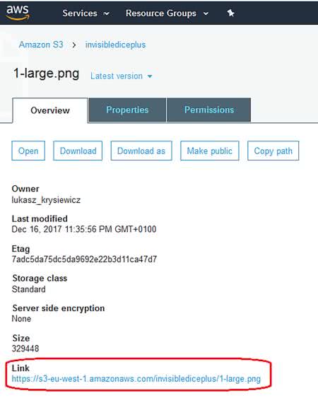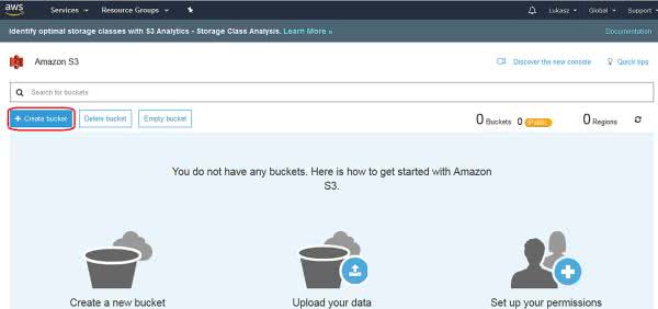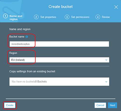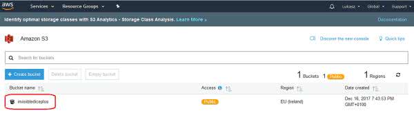 Skorzystamy z rozwiązania oferowanego przez firmę Amazon, jakim jest S3 (Simple Storage Service). W celu konfiguracji serwisu S3 logujemy się do platformy AWS (http://aws.amazon.com). Następnie uruchamiamy zakładkę Services i wybieramy S3, jak na rysunku 6. W kolejnym kroku, wybieramy utworzenia nowego magazynu danych (rysunek 7). Podajemy nazwę magazynu (invisiblediceplus) oraz region, w którym będą umieszczone dane (EU Ireland).