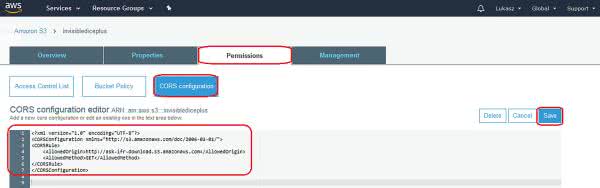 Na zakończenie konfiguracji magazynu danych ustawimy politykę dostępu CORS (Cross-origin resource sharing). W tym celu wybieramy zakładkę Permissions. Następnie uruchamiamy edytor konfiguracji CORS. Wprowadzamy ustawienia i zapisujemy konfigurację, jak na rysunku 13. Plik z ustawieniami CORS jest dostępny w folderze projektu.
